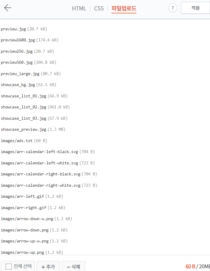html편집을 누르게 되면 상단에 HTML/CSS/파일업로드 이렇게 세 가지가 보이는데